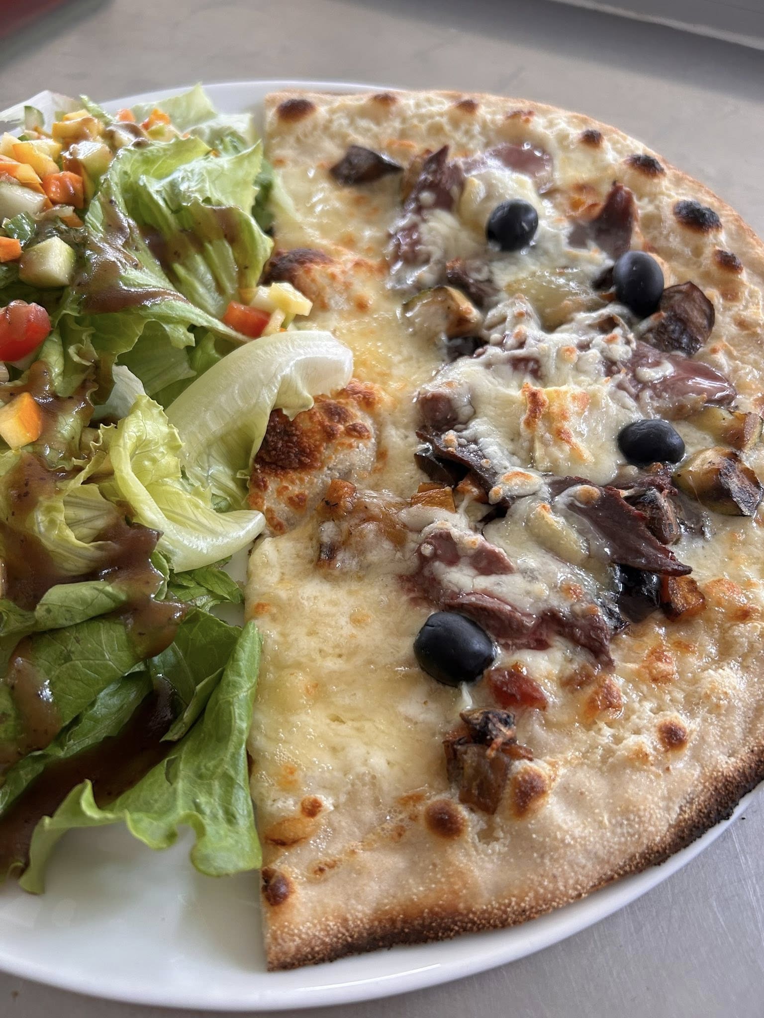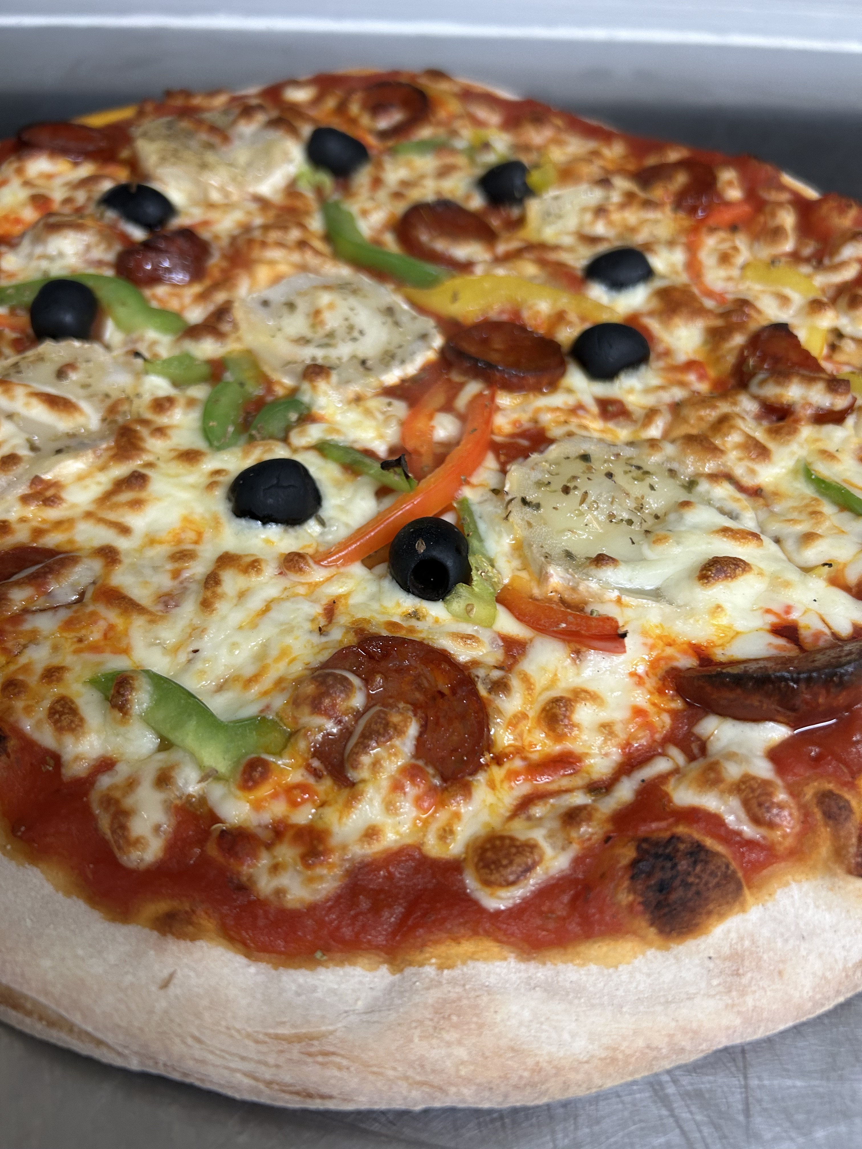 Chorizo, jambon de pays, poivrons, chèvre, olives, origan, mozzarella