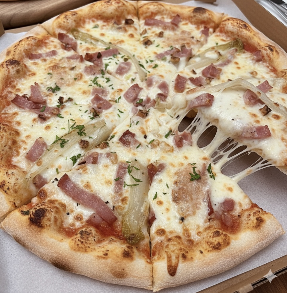 Jambon de pays, jambon blanc, lardons, pommes de terre , fromage à raclette et mozza