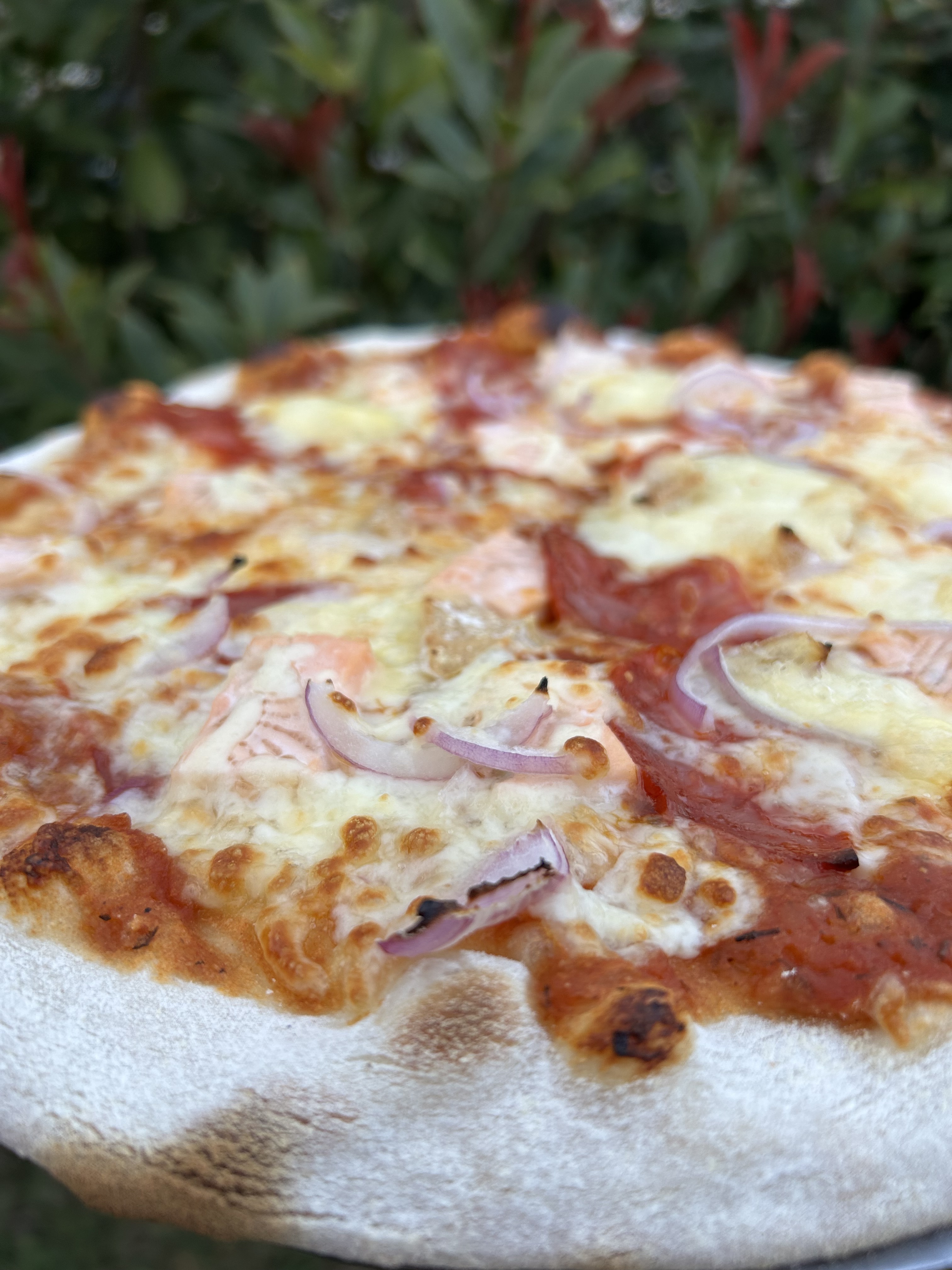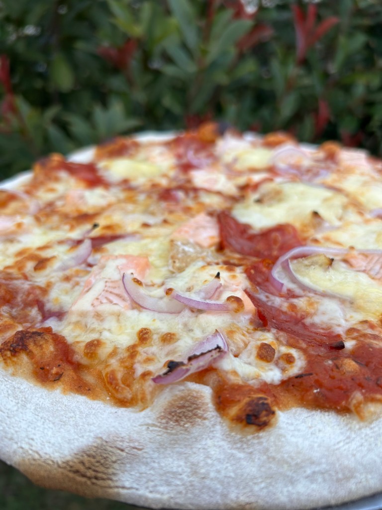 saumon, chorizo, oignons, St Nectaire, mozzarella